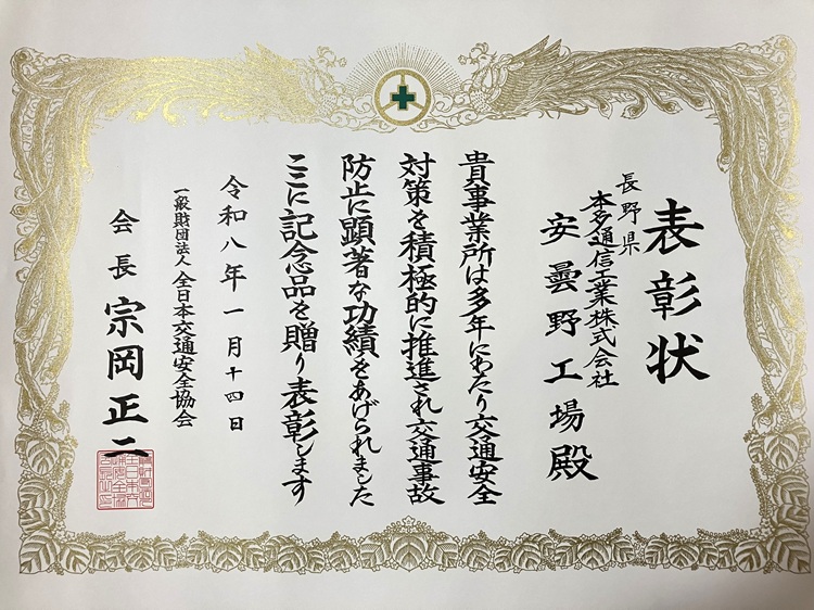 2026年1月14日、一般社団法人 全日本交通安全協会および警察庁が主催する「第66回 交通安全国民運動中央大会」において、当社 安曇野工場の交通安全への取り組みが評価され、「交通安全優良事業所」として表彰いただきました。